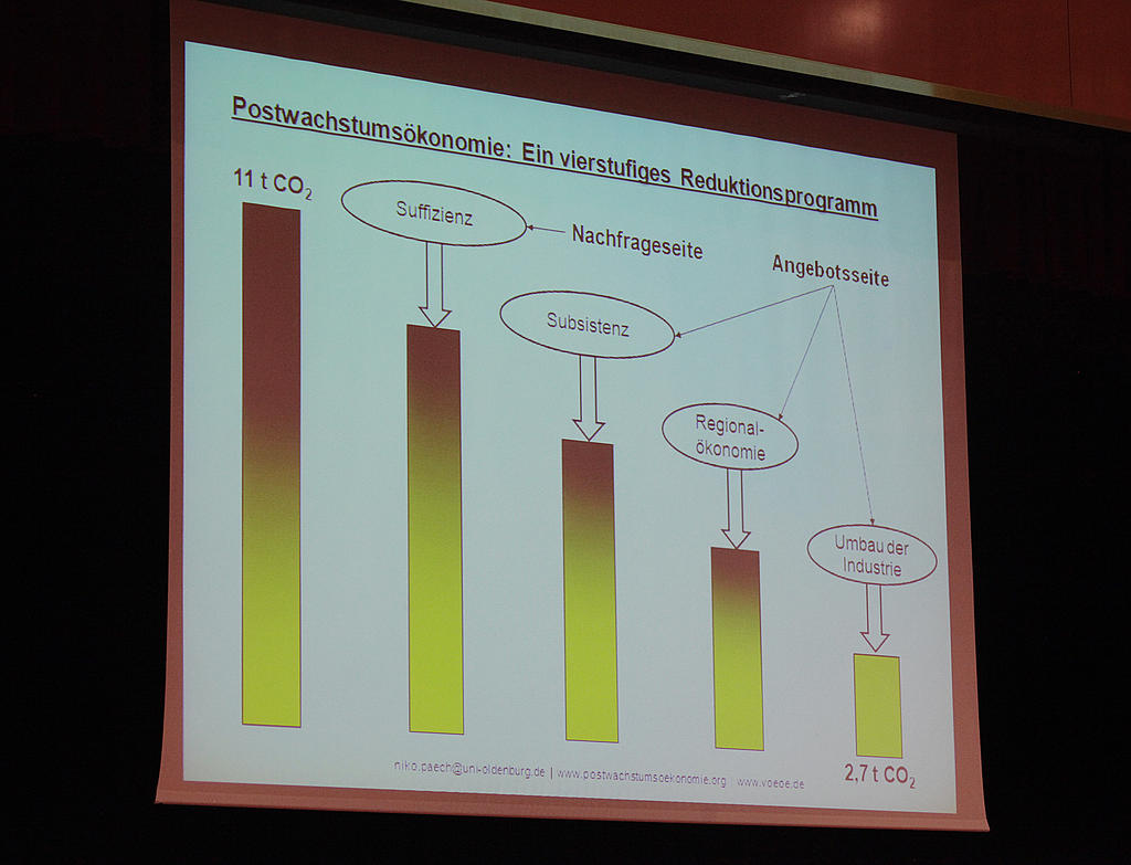 Die zentrale Botschaft von Niko Paech an diesem Abend ist, durch den Verzicht von Konsum und die Reduktion der Arbeitszeit (auf 20 Stunden) und damit des Einkommens die Industrieproduktion zu halbieren. Dies sei notwendig um die Klimaschutzziele zu erreichen. Der Konsument solle sich vom reinen Konsumenten durch Subsistenz und Suffizienz (Teilen, Selbst machen, Reparieren, Verzichten, …) zum Prosumenten (Konsument und Produzent) entwickeln.