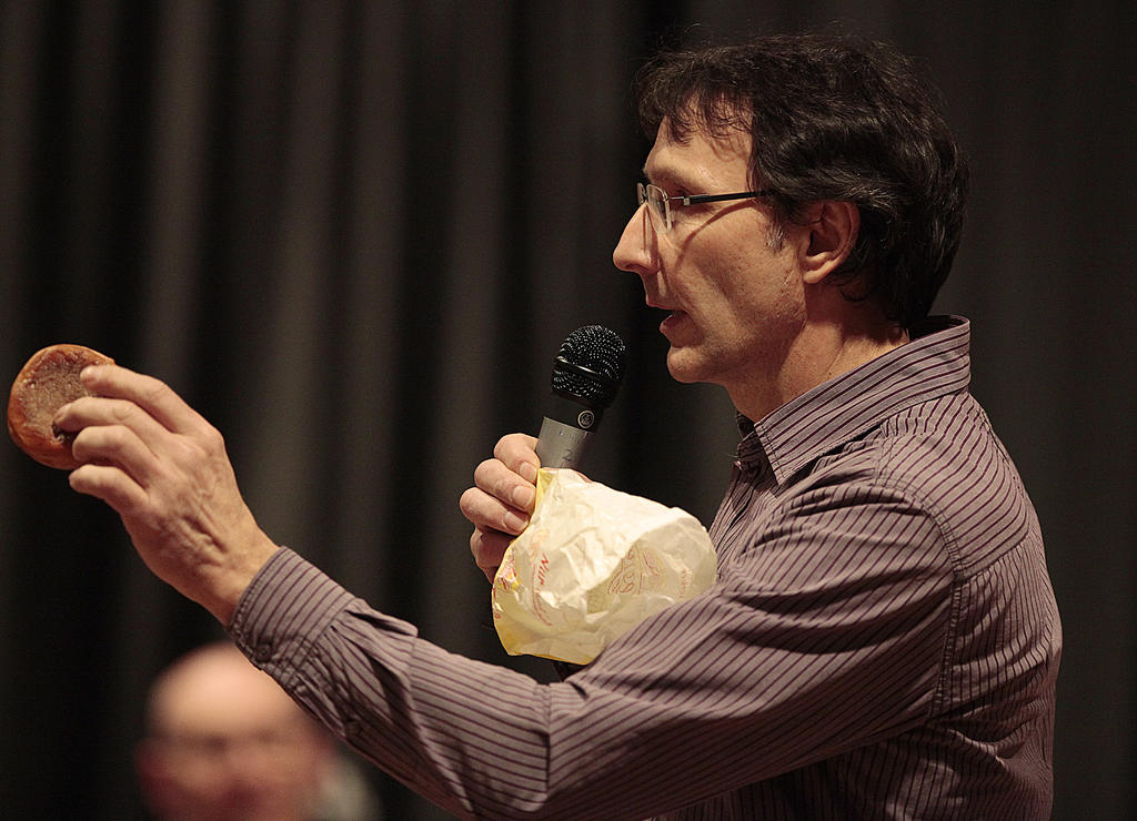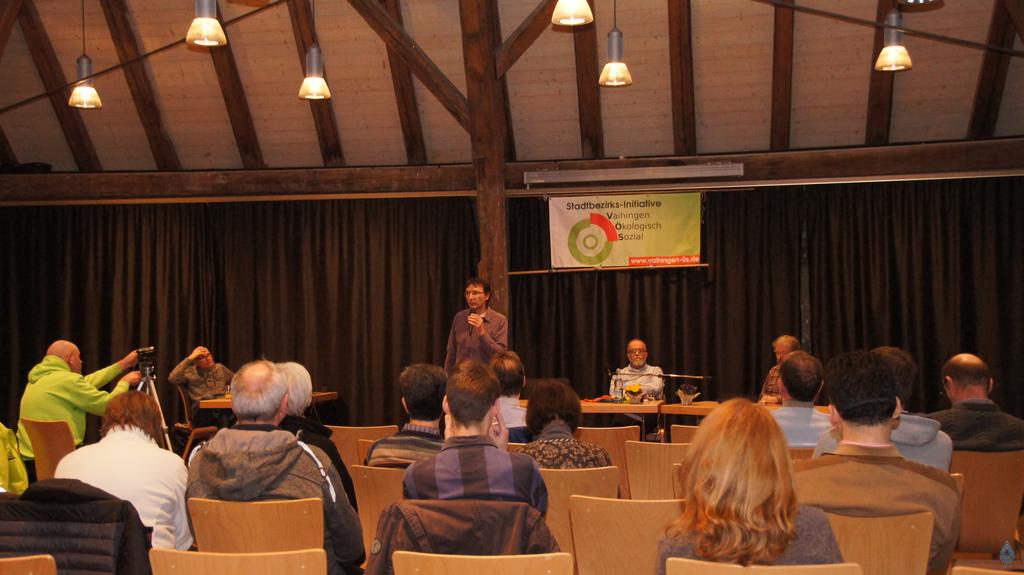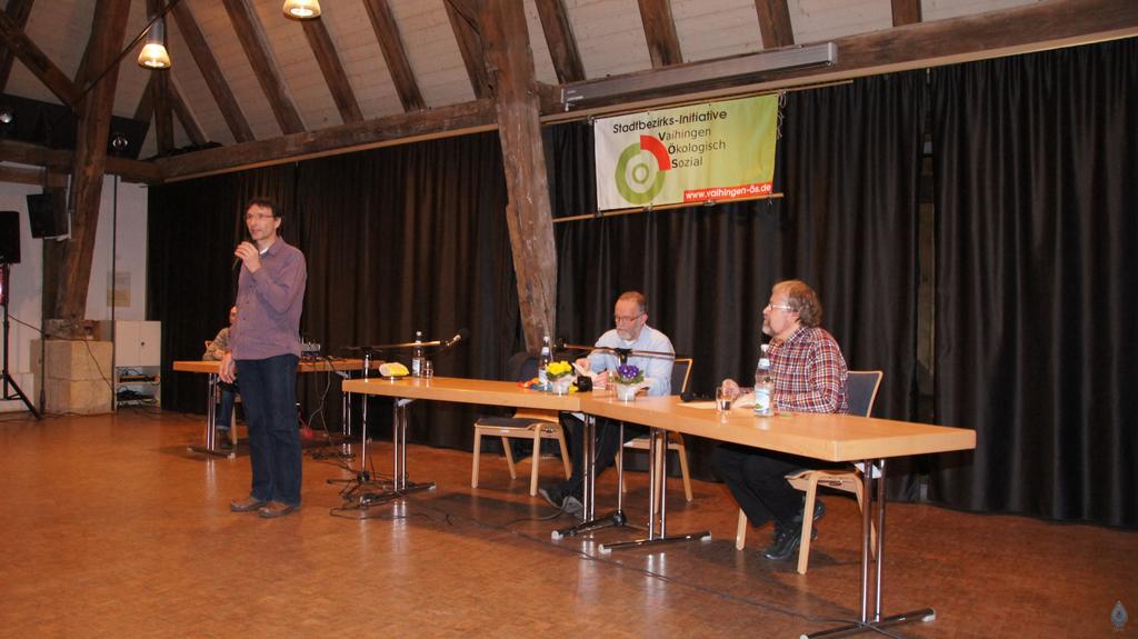 Dienstag 15. März, 19:15 Uhr, 150 Gäste und gute Stimmung im Rudi-Häussler-Saal in Stuttgart-Vahingen. Nach einer kurzen Begrüßung durch Cornelia Geeve beginnt ein gut gelaunter Niko Paech seinen Vortrag. Wie immer zieht er die Zuhörer schnell in seinen Bann.